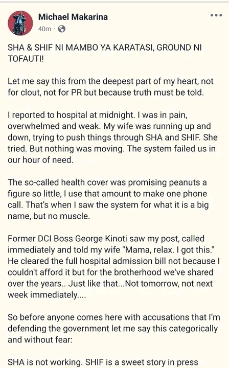 Makarina, who had often paraded his loyalty to government programs by saying “System iko sawa” in public events, is now singing a different tune. His experience with SHIF has changed his outlook completely.