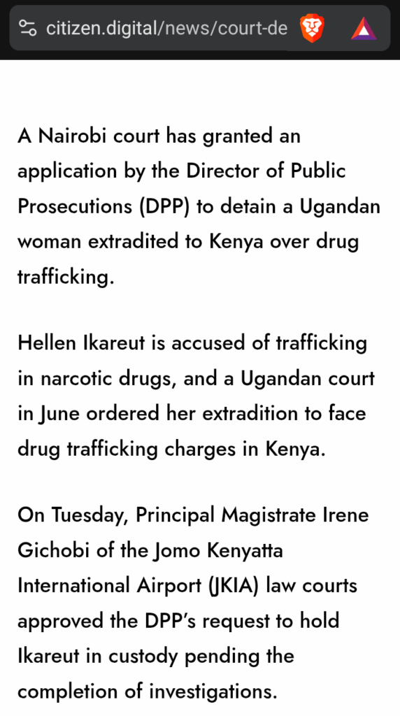 A Nairobi court has allowed the Director of Public Prosecutions to detain a Ugandan woman named Hellen Ikareut, who was extradited to Kenya to face drug trafficking charges.