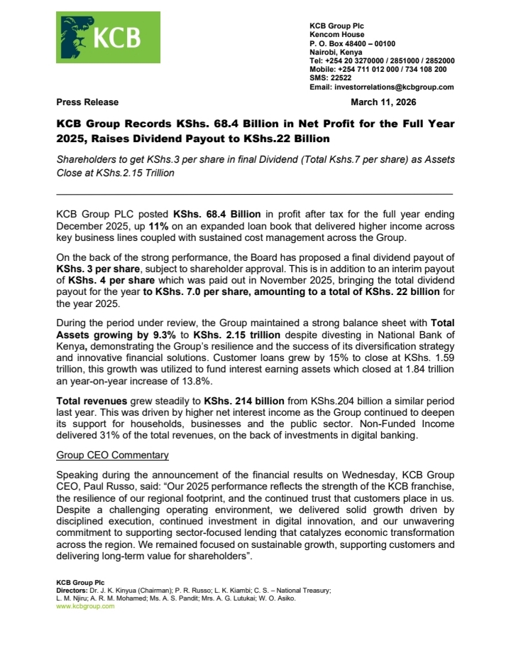 KCB Group Plc posted KShs. 68.4 billion in profit after tax for the full year ending December 2025, marking a strong financial performance for the banking group.