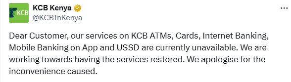 KCB posted a short message on X confirming the outage and apologizing for the inconvenience, but it offered no explanation for what caused the system to crash.