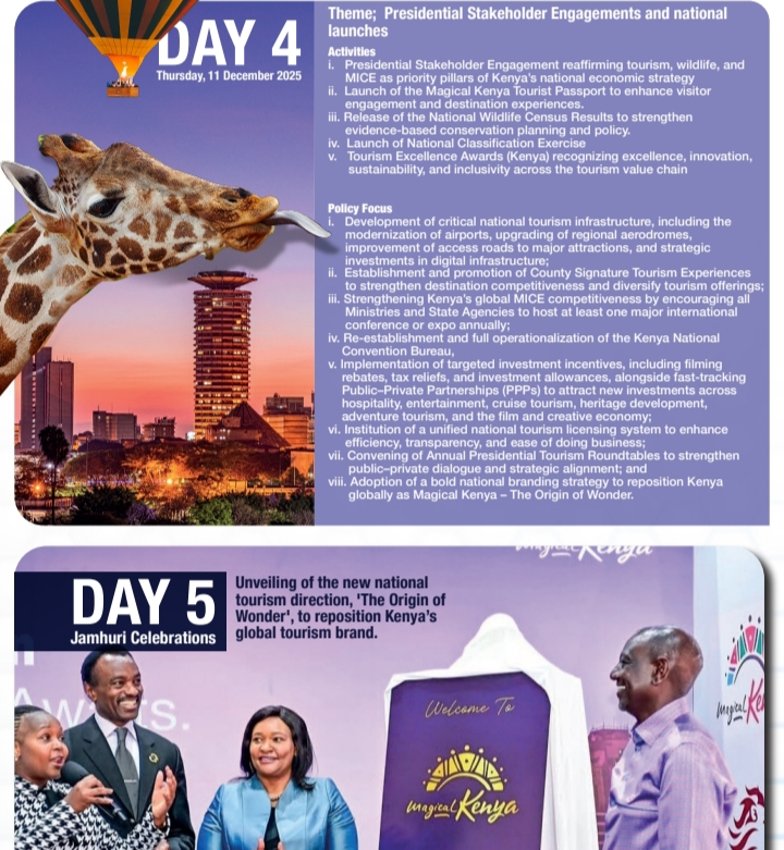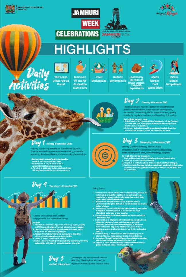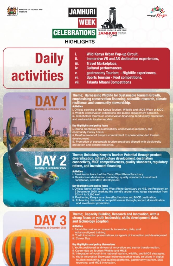 Kenya’s Jamhuri Week programme presents tourism as a serious national development tool rather than a seasonal activity. The structure of the week shows clear planning, with each day assigned a specific theme that connects conservation, investment, innovation, skills, and national branding.