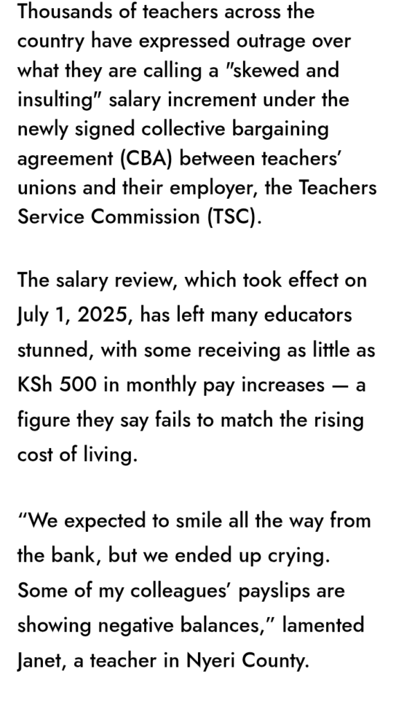 Thousands of teachers across Kenya are angry after receiving what they call an unfair and disappointing salary increment under the new collective bargaining agreement signed between their unions and the Teachers Service Commission.