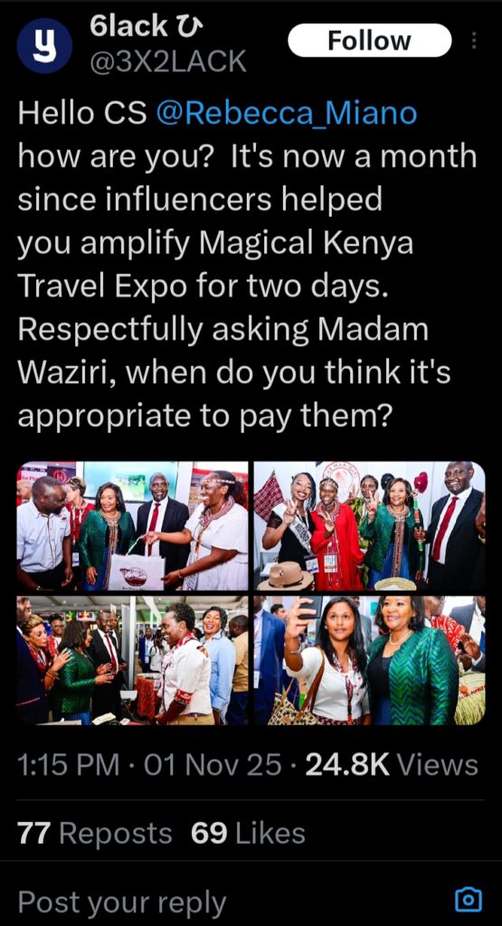 On November 1, 2025, the user directly addressed Rebecca Miano on X, asking when the influencers who helped promote the Magical Kenya Travel Expo would be paid.