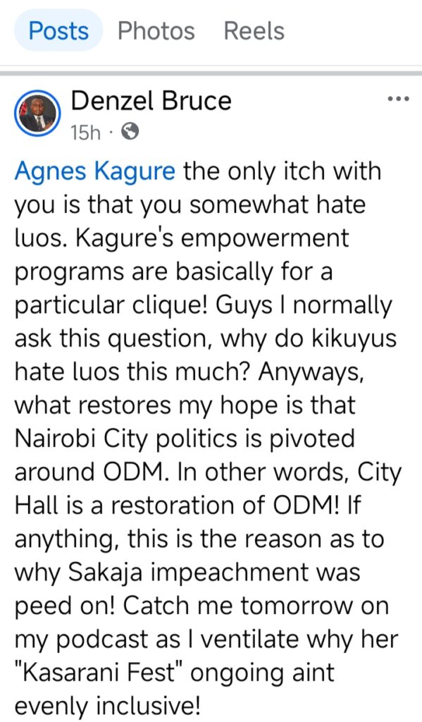 Instead of constructive debate, he has resorted to fueling tribal sentiments by accusing Kagure of hating Luos and framing Kikuyus as being hostile toward Luos. Such reckless utterances do not help solve real challenges facing Nairobians.