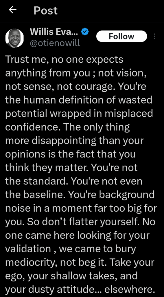Otieno did not hold back. In a scathing post, he tore apart Kangara’s academic image, calling her a wasted opportunity wrapped in ego and empty words. He accused her of lacking courage, vision, and moral clarity.