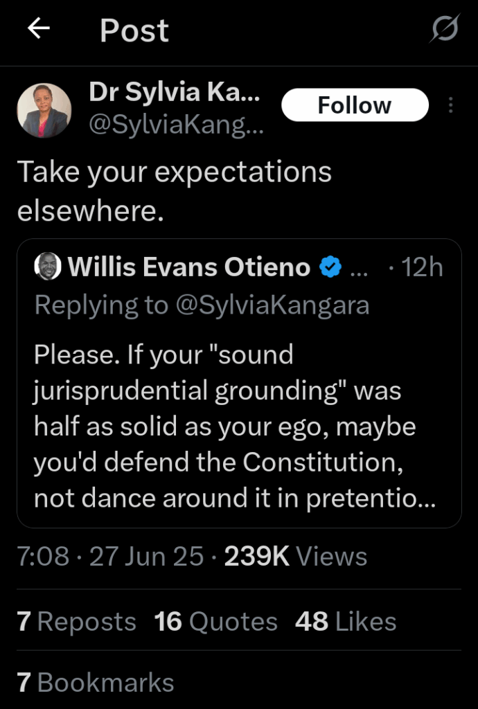 According to Otieno, Kangara’s presence in the debate was just background noise in a time when the country needed real leadership, not legal cover for state overreach. He went further to say her opinions were not only irrelevant, but it was shocking that she believed they mattered at all.