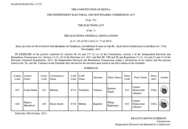 The Independent Electoral and Boundaries Commission made the announcement through Gazette Notice No. 15732 dated October 29, 2025, confirming that Tembelio Ward in Uasin Gishu County and Metkei Ward in Elgeyo Marakwet County will not hold competitive elections.