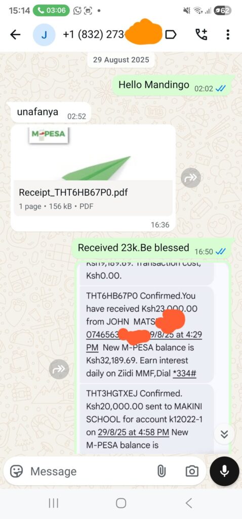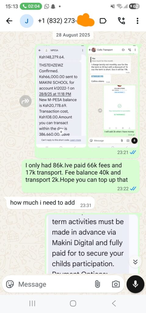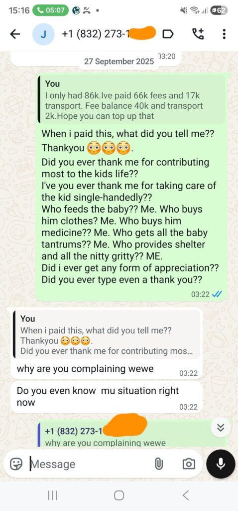 Oginga also posted fee breakdowns showing she had already paid KSh 66,000 out of a total of KSh 106,000, leaving KSh 40,000 and additional transport money remaining. Other messages show her frustration growing as she tried to explain the financial burden she was carrying alone. The tone between the two worsened, with her threatening to formalize his absence legally and insisting that she would not allow disrespect any longer. In one of her strongest statements, she warned that she had tolerated enough and was about to take action.