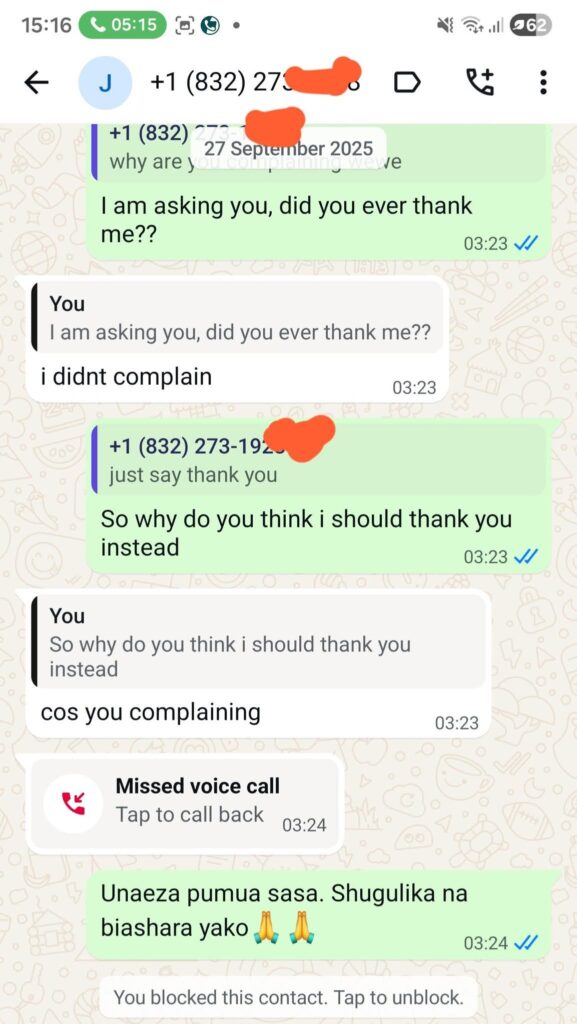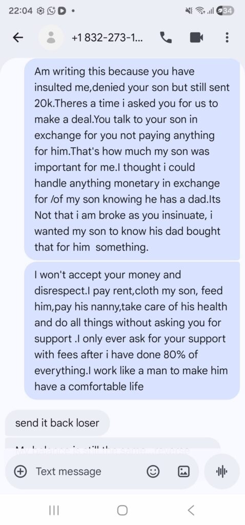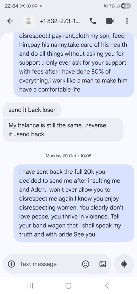 Screenshots also show heated conversations about money. In one case, she says Matsekhe sent her KSh 20,000, but she returned it because of what she described as degrading treatment.